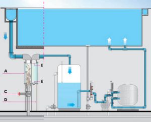 Внутри находится перфорированная перегородка, отверстия которой позволяют воде проходить, но сохраняют грубые загрязнения, такие как листья и ветви. Если этот сборный контейнер заполнен, владелец бассейна просто открывает встроенный запорный клапан. Таким образом, собранная, задержанная грязь сливается в канализацию.